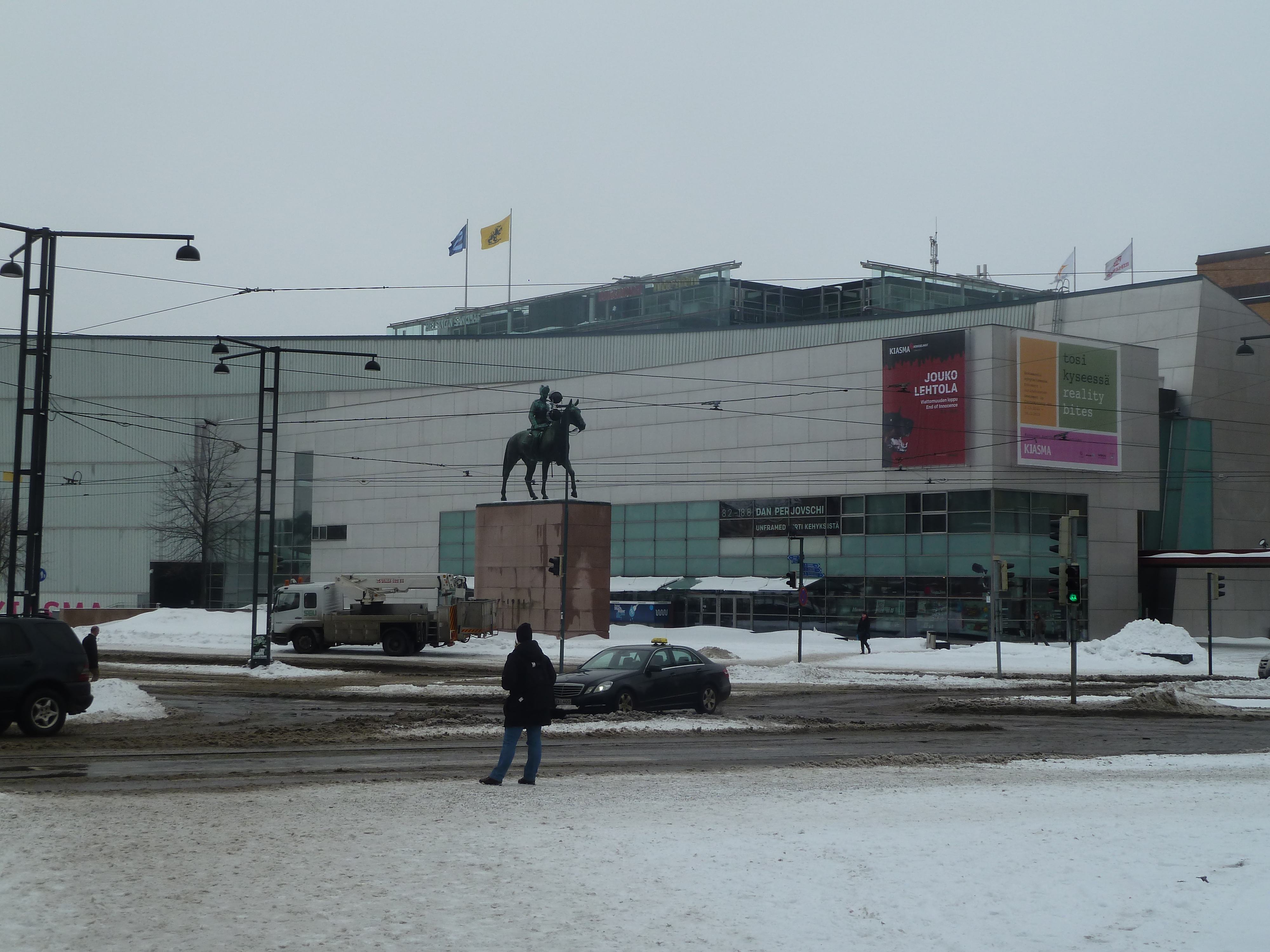La gare centrale (en finnois Helsingin päärautatieasema) avec ses 4 statues massives d’hommes tenant des globes.