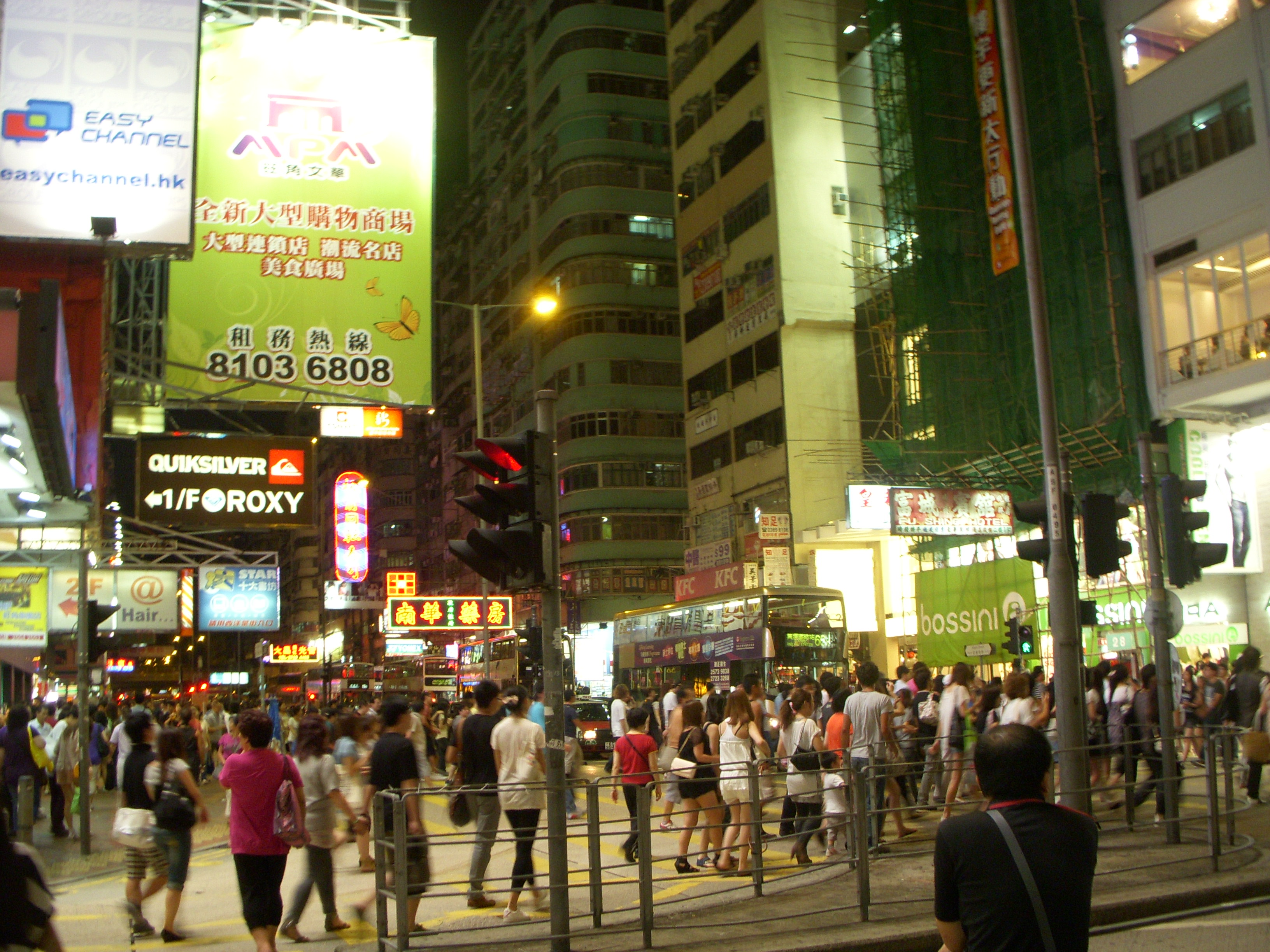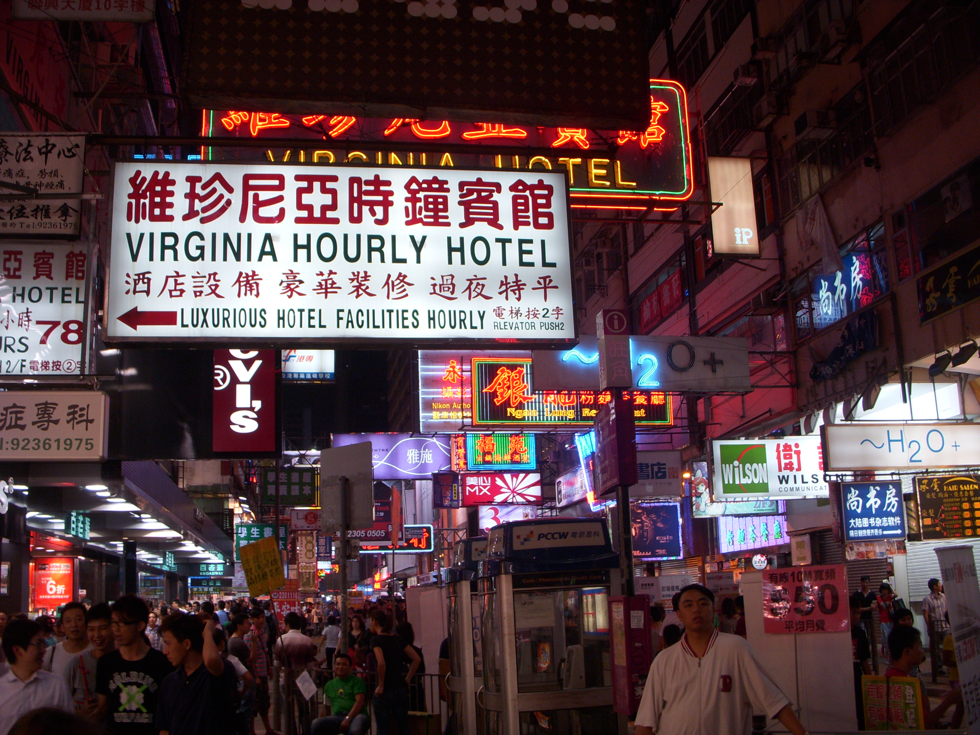 Hong Kong by night. Il y a des panneaux publicitaires partout où notre regard se pose, ils envahissent les rues de tous les côtés et au-dessus de nos têtes. Sur cette photo, on peut aussi voir un autre aspect d’Hong Kong avec ce panneau pour chambre d’hôtel à l’heure.