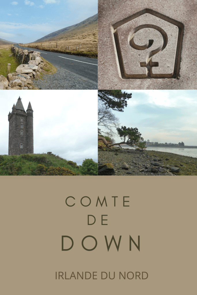 Le comté de Down se trouve au sud de Belfast. Il est vraiment différent de celui d’Antrim, ses côtes sont moins escarpées. Néanmoins il ne manque pas d’attraits. On y trouve une petite chaîne de montagnes, les Mourne mountains, au bord de la mer. On y trouve aussi un grand lac, le Strangford lough. C’est également le comté du saint irlandais saint Patrick puisqu’il est enterré dans la ville de Downpatrick.