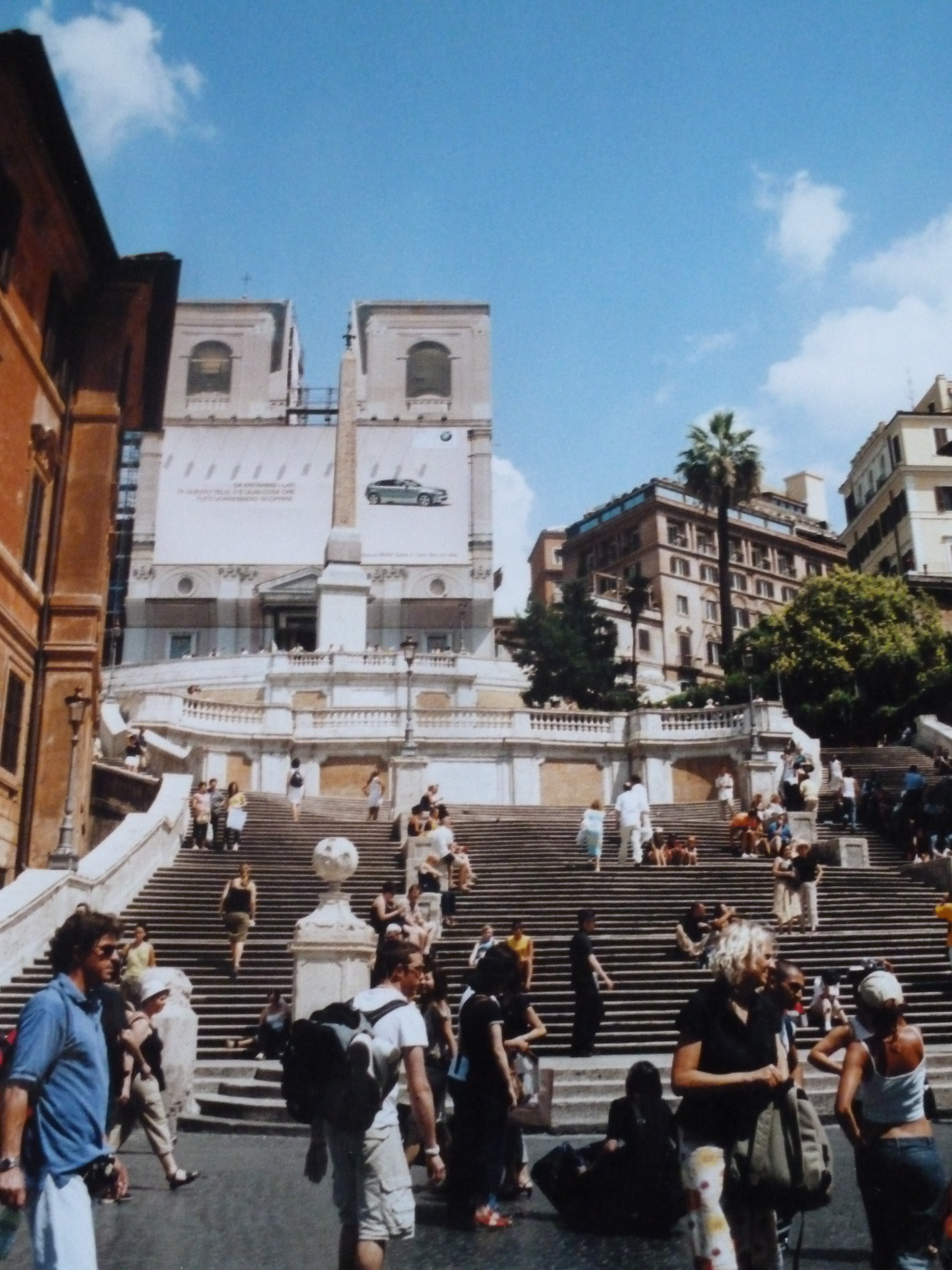 Un autre point incontournable de la visite de Rome est la Piazza di Spagna (la place d’Espagne). Elle est nommée ainsi car c’est l’adresse de l’ambassade d’Espagne. Elle est notamment célèbre grâce à son escalier menant à l’église de la Trinité-des-Monts (Trinità dei Monti). Malheureusement lors de ma visite, l’église était en restauration (ça arrive beaucoup en Italie) et décorée d’une énorme pub pour une voiture, déception totale.