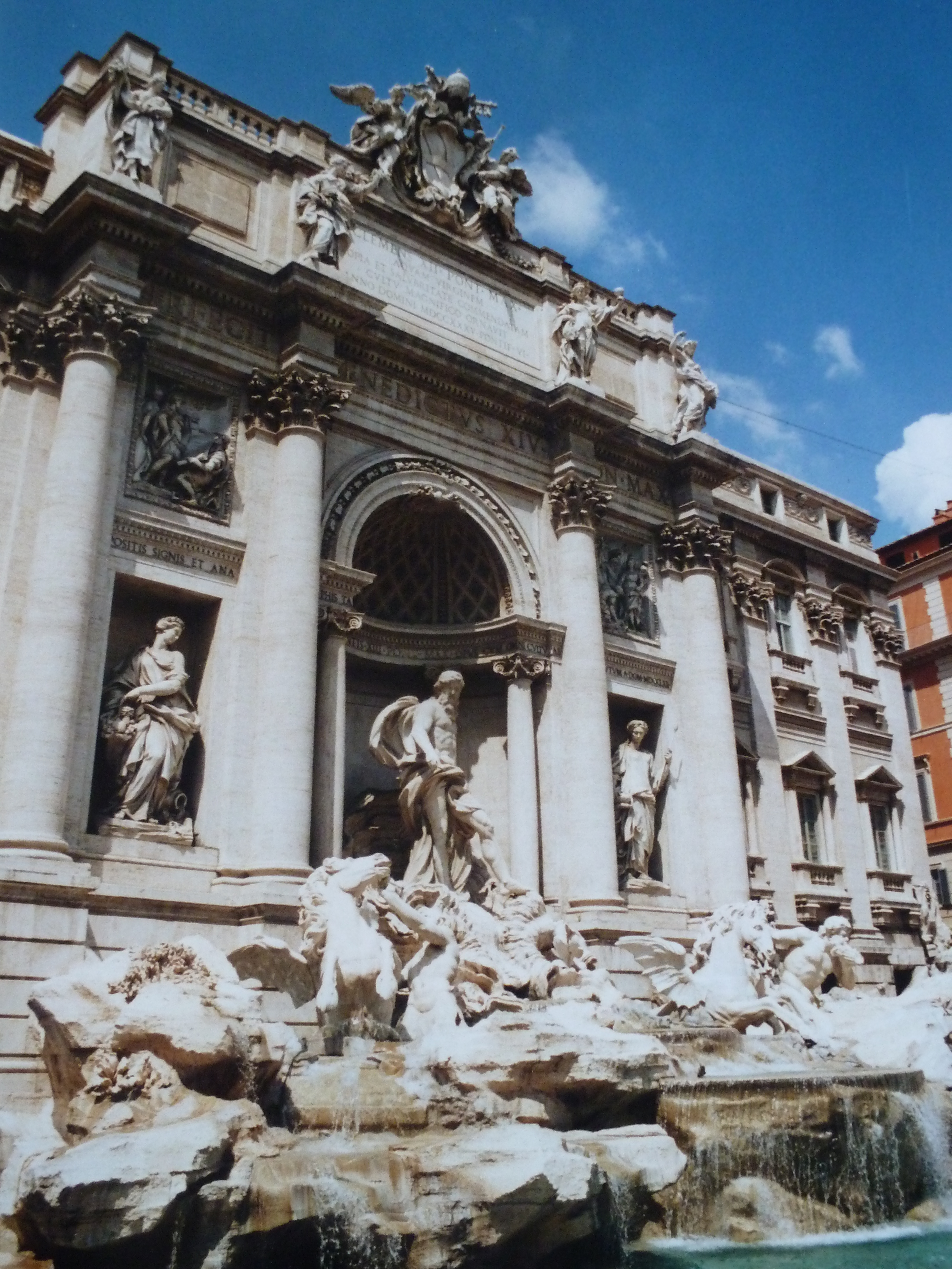 La fontaine de Trevi est le rendez-vous des amoureux à Rome. On se souvient tous de la scène mythique du film « la dolce vità » avec Anita Ekberg dans la fontaine sous les yeux d’un Marcello Mastroianni médusé. Elle est située au carrefour de trois rues, ce qui lui a donné son nom (tre vie en italien). Elle est effectivement très belle et imposante. Elle est presque cachée dans les petites rues alors que je l’imaginais trônant sur une grande place. Elle date du XVIIIe siècle mais les canalisations romaines arrivaient déjà à une fontaine à cet endroit précis. Ce sont d’ailleurs toujours les canalisations romaines qui alimentent la fontaine (ils sont forts ces Romains!). La tradition veut qu’on jette une pièce par-dessus son épaule dans la fontaine pour s’assurer de revenir dans la ville éternelle…et en plus, l’argent récolté va aux bonnes œuvres.