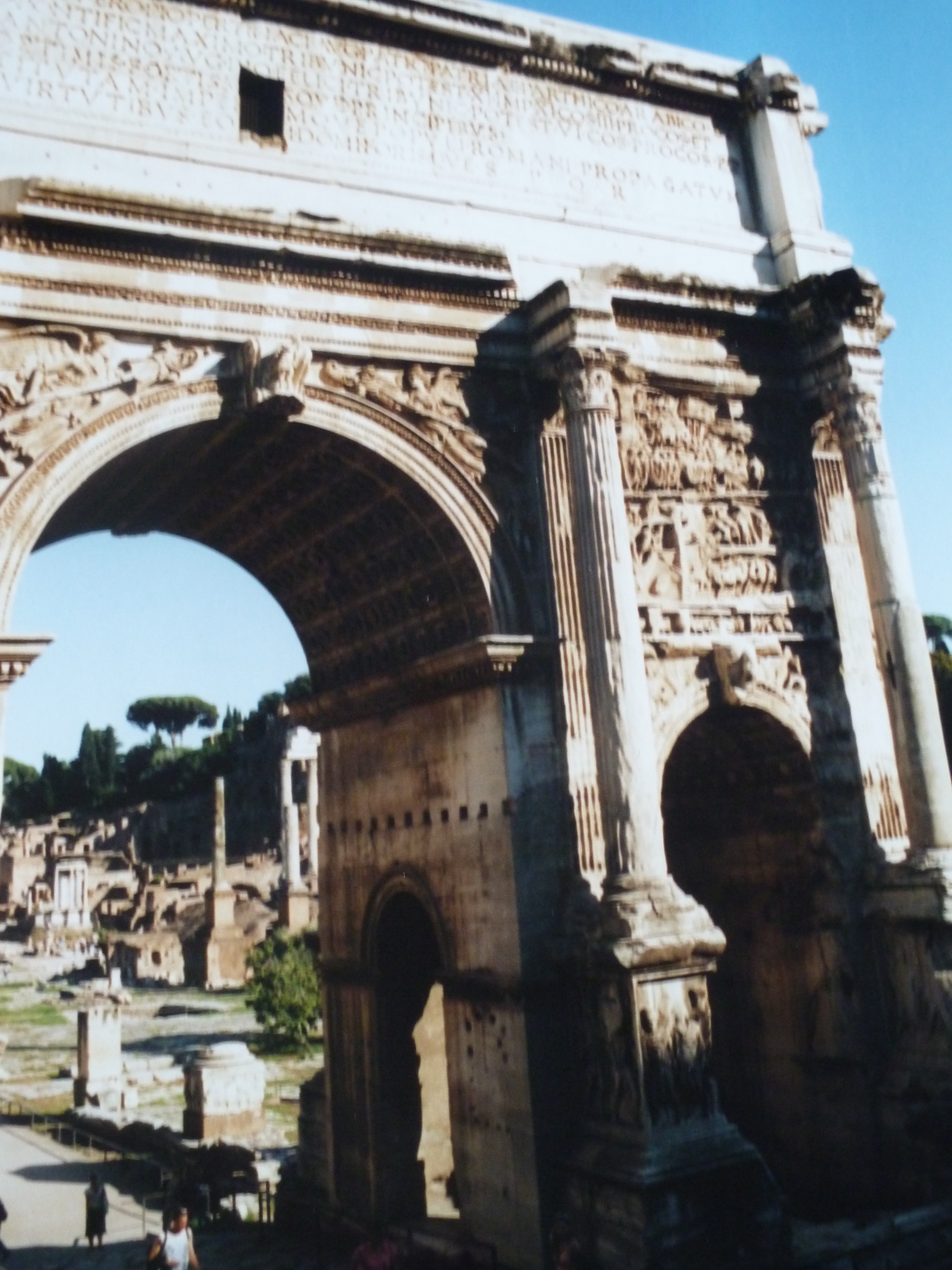 A côté, on trouve un autre arc de triomphe, celui de Septime Sévère (Arco di Settimo Severo). Comme son nom l’indique, il est érigé en 203 pour honorer les victoires militaires de l’empereur Septime Sévère et de ses fils. On dit que son emplacement marquerait le centre de la Rome antique (umbilicus urbis).