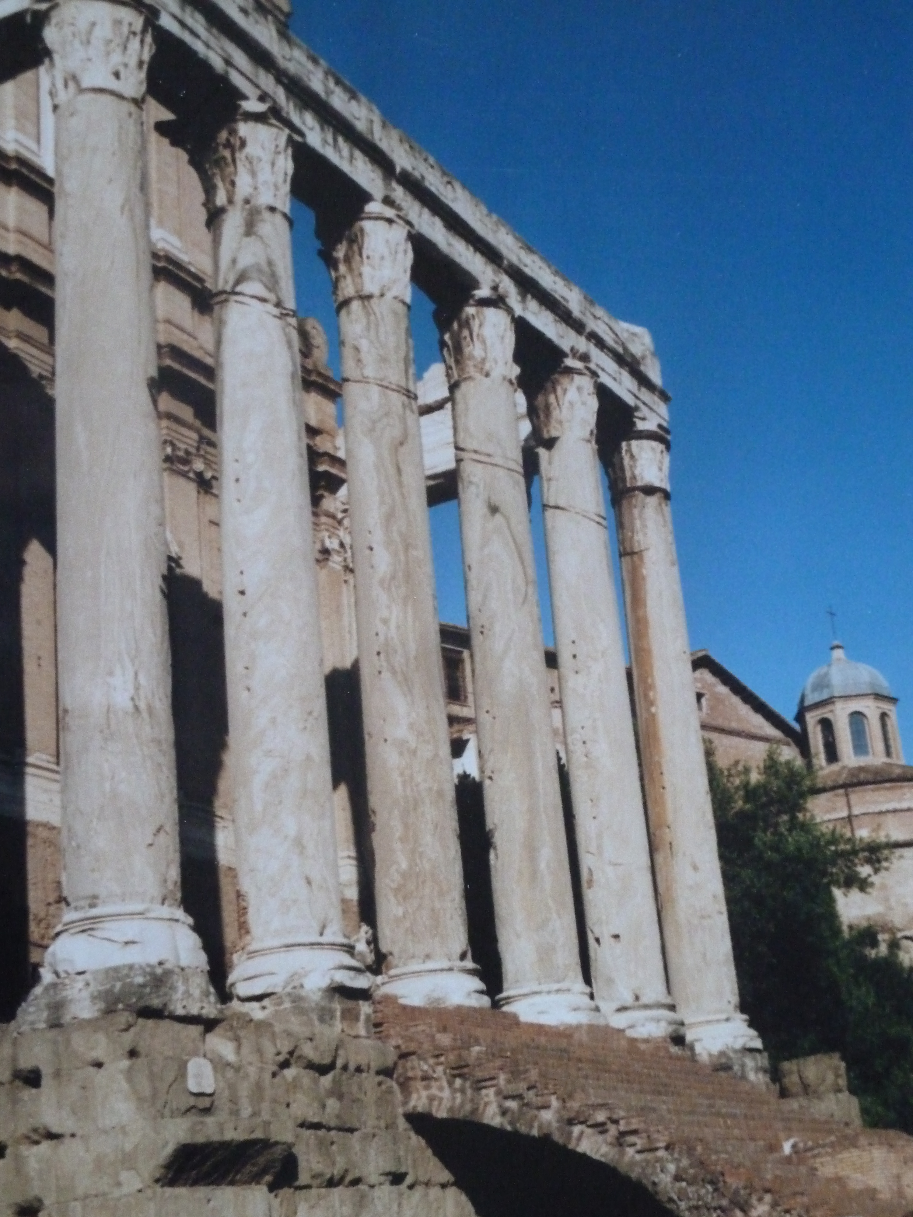 Plus loin dans le forum, on trouve le Temple d’Antonin et Faustine. Il a été édifié en 141 en l’honneur de l’impératrice Faustine érigée en déesse à sa mort cette même année. Il fut ensuite consacré à l’empereur Antonin (son mari). Au VIIIe siècle, il est transformé en église.