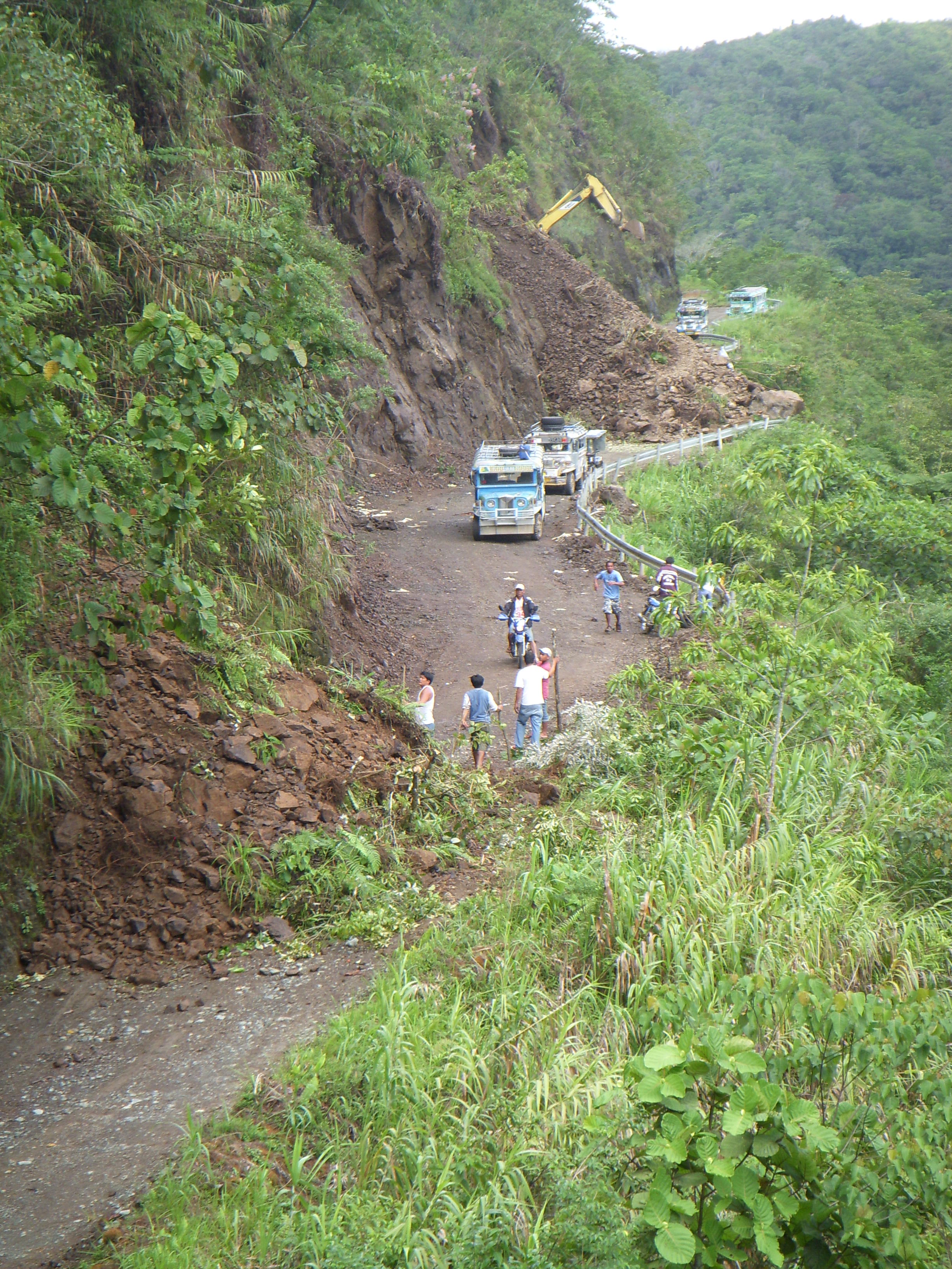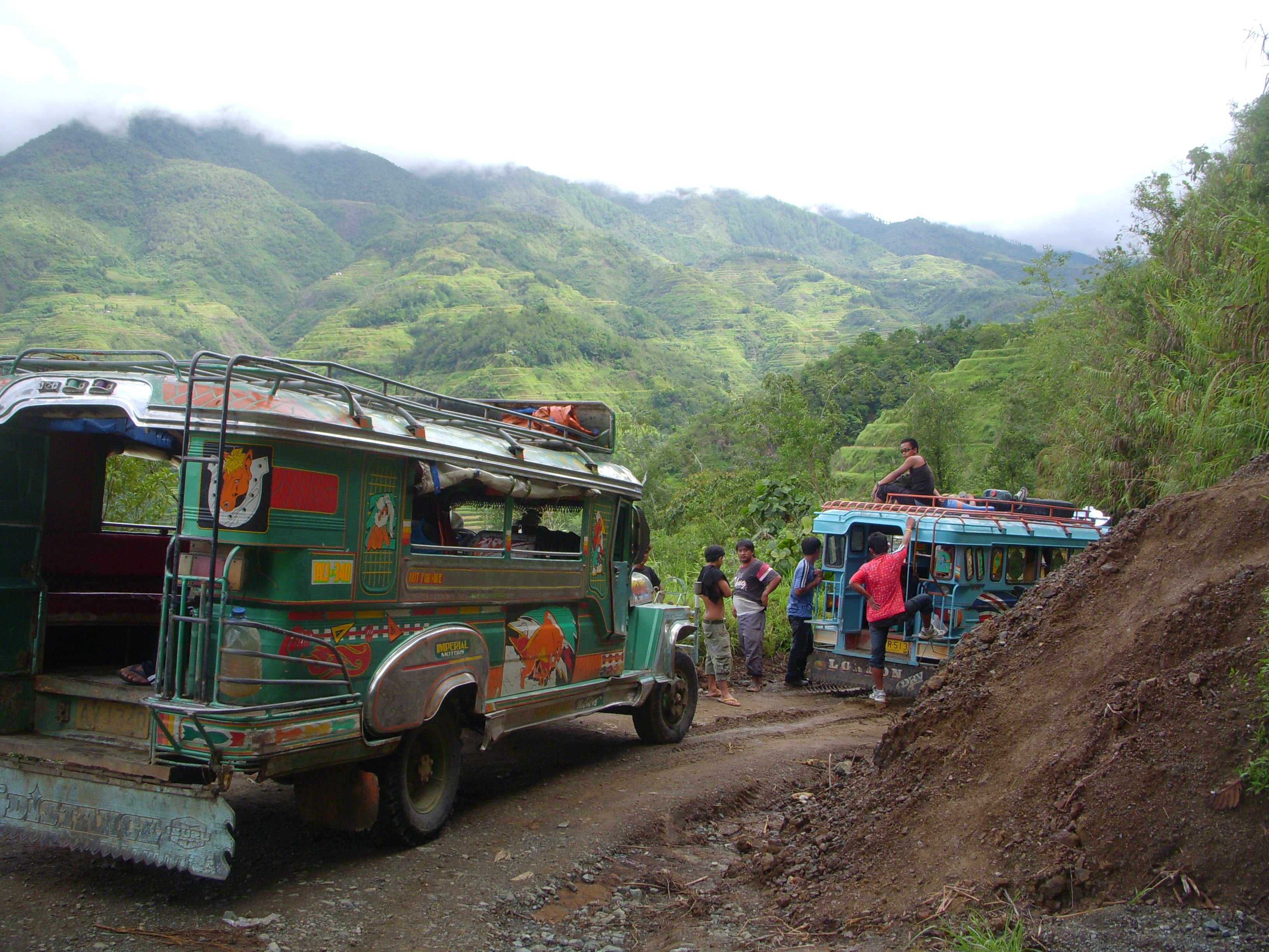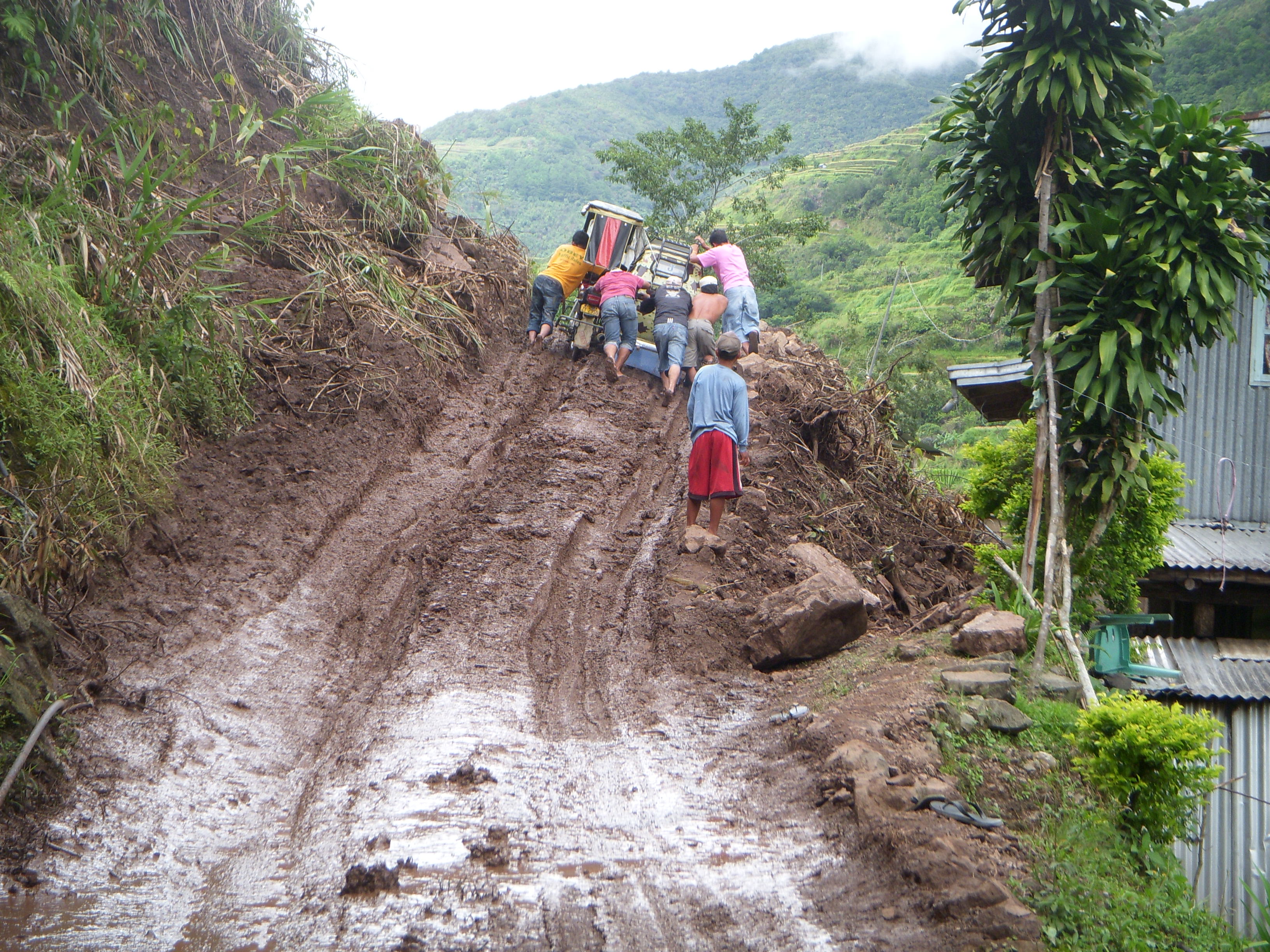 Nous n’avions pas réalisé que les pluies de la veille avaient provoqué des dégâts importants en dehors de Banaue. Les gens du coin y sont habitués car en cette saison, les pluies sont quotidiennes. Nous nous sommes donc retrouvés coincés en chemin par des glissements de terrain. Le troisième glissement de terrain que nous avons croisé était infranchissable pour notre tricycle et nous. Nous l’avons donc abandonné, puis sommes descendus comme nous avons pu sur la route en contre-bas. Nous n’étions pas les seuls à être coincés.