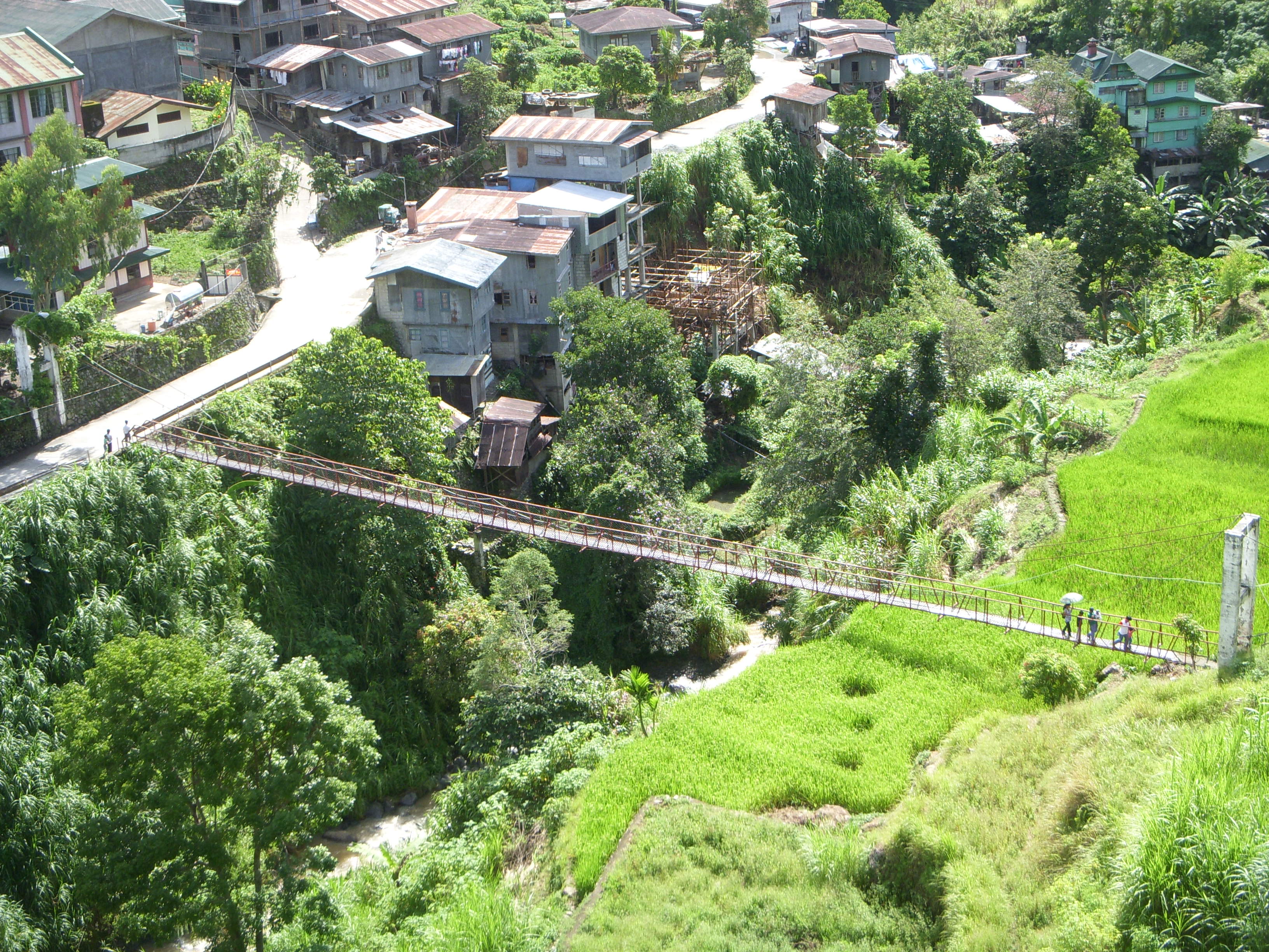Banaue est une petite ville de montagne avec ses toits de taule et ses immeubles à flanc de falaise à 1500 mètres d’altitude. Il y a aussi un paquet d’hôtels, et des guides se proposent un peu partout pour vous accompagner. Les guides sont d’ailleurs indispensables. Nous avions trouvé un étudiant très gentil qui s’est mis en quatre pour nous pendant deux jours (ci-contre, le pont de Banaue qui tient je ne sais pas trop comment avec des planches totalement rouillées et quelques câbles…j’ai dû prendre une grande respiration avant de réussir à traverser!)