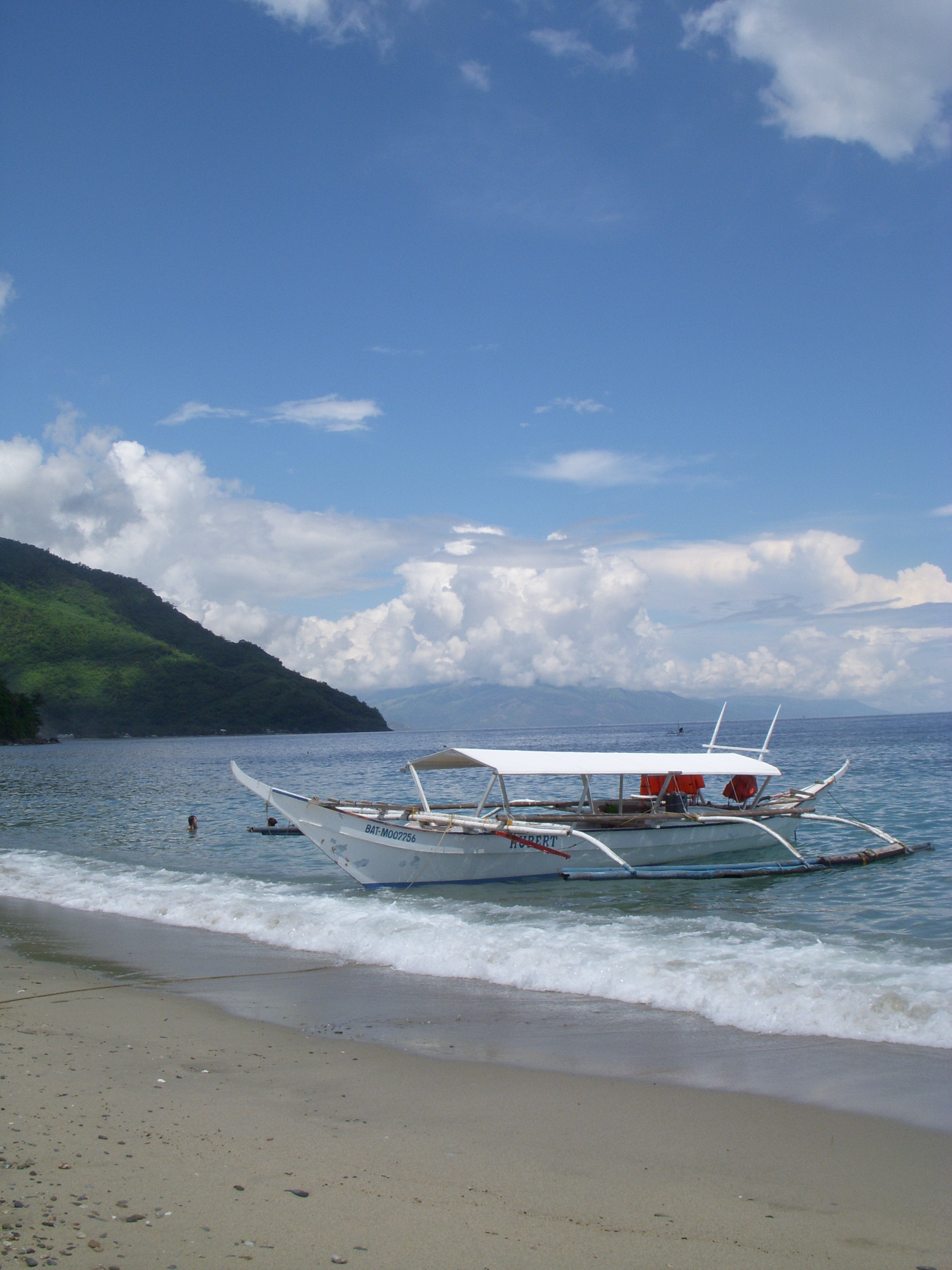 photo (5)L’île de Mindoro est située au sud de Manille. Ce fut ma première escapade loin du chaos de la ville…avec une vraie sensation de bout du monde en prime. Il faut compter deux bonnes heures de bus au départ de Manille jusqu’au port de Batangas (officiellement), mais moi j’ai mis trois heures. Le ticket de bus (ci-contre) est d’un autre âge, il faut le faire poinçonner, et je n’ai pas encore saisi la signification de tous les petits trous. A Batangas, j’ai pris ce qu’on appelle une bangka (ci-dessous), une sorte de grande pyrogue avec des flotteurs de chaque côté…DSCN5858et ça n’est pas aussi stable qu’il n’y paraît. C’est le seul moyen de naviguer entre les différents îlots de Mindoro. Il faut environ 1h30 de bateau pour rejoindre Puerto Galera. Pour ma part, j’ai continué le voyage jusqu’à White Beach, une plage de sable blanc qui porte bien son nom. On touche un petit coin de paradis. Il y a très peu de touristes (bon, j’ai quand même croisé deux ou trois Américains venus chercher les faveurs de jeunes Philippines, ce qui m’a profondément dégoûtée), et cela donne déjà une impression de bout du monde. Certes, il y a quelques bars le long de la plage mais ce n’est pas encore vraiment une destination touristique. DSCN5813Les montagnes, la mer émeraude, le sable blanc…il ne m’en fallait pas beaucoup plus pour oublier Manille le temps d’un week-end. Ah si! Il fallait encore quelque chose: des mangues fraîchement coupées (ces petites mangues jaunes sont bien loin des grosses mangues vertes que l’on trouve en Europe, et sont un véritable délice). J’ai donc passé deux jours sur la plage, sous des cocotiers protecteurs (le soleil est assez cruel sous ces latitudes pour une peau de porcelaine comme la mienne), à siroter des jus de mangues (avec ou sans rhum), à regarder les îles à l’horizon et à me dire qu’il faut peu de choses pour être heureux. DSCN5820White Beach (et l’île de Mindoro en général) est un bon spot pour la plongée sous-marine et le snorkeling. N’étant pas une grande nageuse, j’ai passé mon tour. Mais mes camarades de week-end en ont bien profité, et ont aussi fait un night-dive (une plongée de nuit). Les petits hôtels à côté sont très bon marché (mais ne pas chercher le grand luxe, il n’y en a pas).
